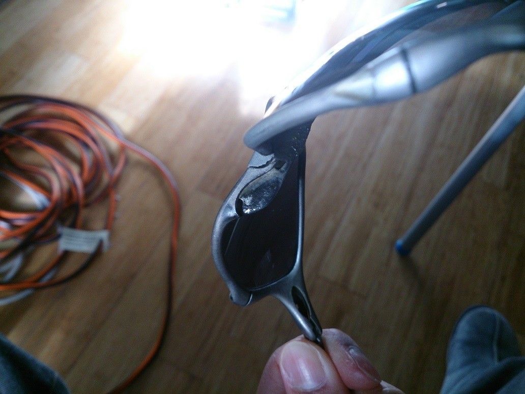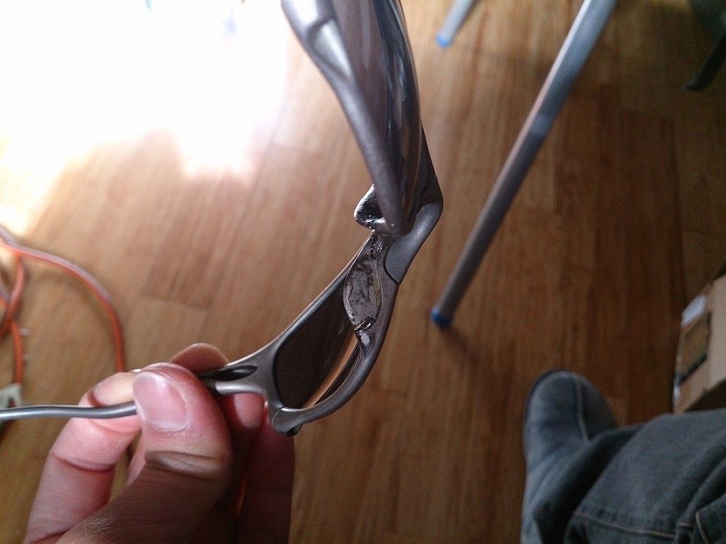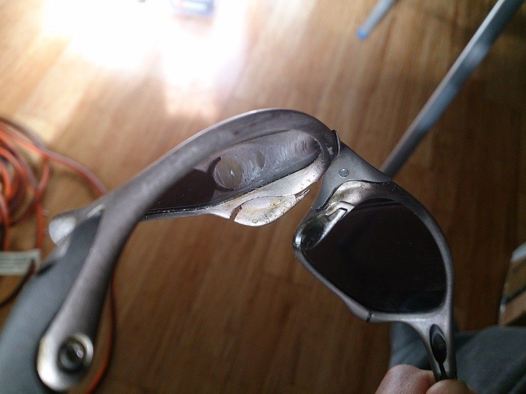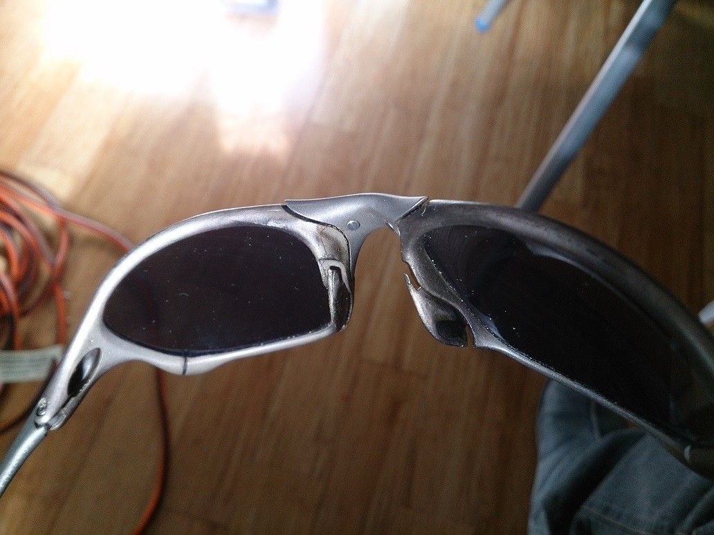 That looks just like the 1st Gen Plasma that I bought (nose bridge/pins a little worse for wear though). What the hell are these people using these poor sunglasses for, the gunk that us on them looks like they had fallen in someone's deep frying pan, yuck!!!Next up: the worst conditioned x-metal I'd ever bought.... an XXTiO2 1st gen that was in a revolting horrific state: gunk, grime and grease everywhere. I'd have donned a HAZMAT suit if I had one! I guess I should have expected the bio-hazard as the frame had ample warnings: heavyblack spotblack patch corrosion and light yellowing on plasma. I'm NOT looking forward to deal with this one......