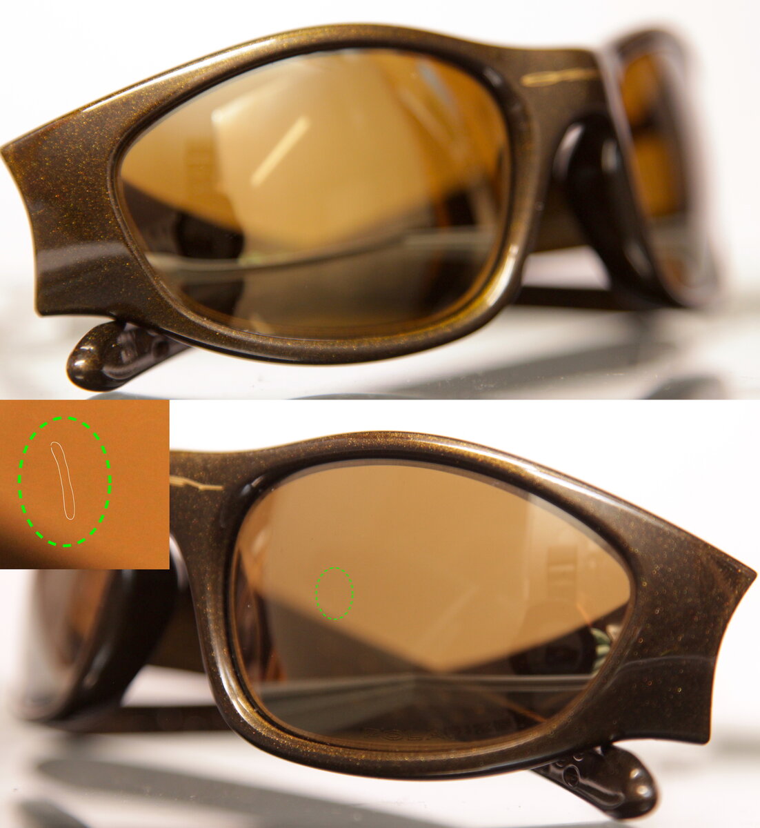 Left lens shows a faint ~5mm hairline scuff; highlighted in photos.