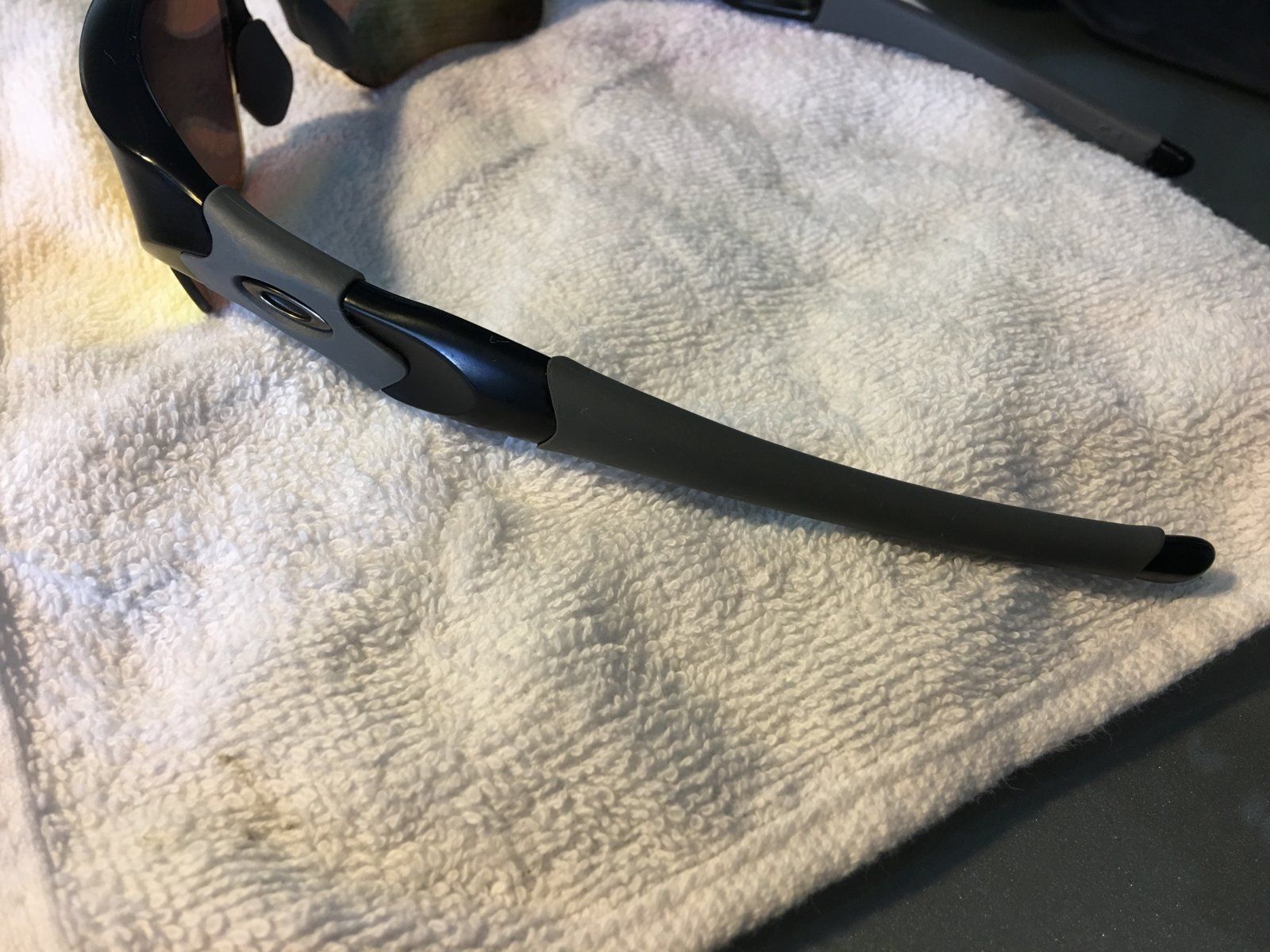 I also tried a wipe on a pair of Flaks i wore today. The unobtanium is about a year old and is used as my daily pair for regular and sports use. The earsocks are getting on the tacky side and will likely need to replace soon. I was coaching my son's T-ball game today under the sun and the earsocks were a bit oily from use. I used a wipe to quickly wipe down the entire frame (sans lenses) and then immediately rinsed under cold water and they feel clean, but still a bit tacky.