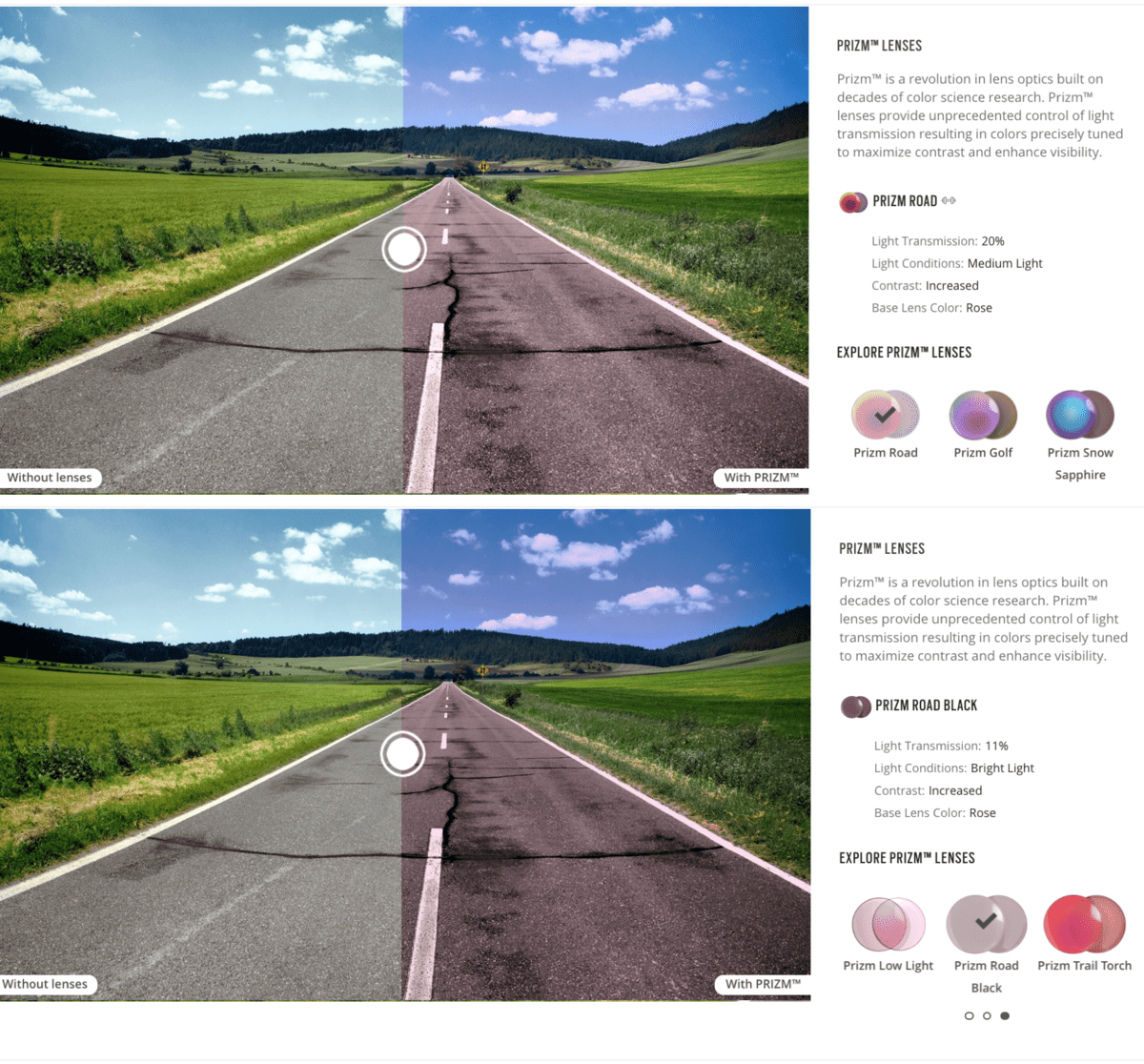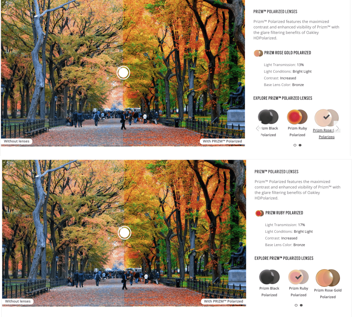For example the prizm road vs prizm black road can be slightly noticed, however between prizm rose gold polar and prizm ruby polar isn't evident as far as I can tell. For their sport specific tints they do offer video's with on/off comparison which might work better to understand the tint over the slider, but still feel faked in that it's a post production filter rather than a actual gopro viewing through that particular tint. https://www.oakley.com/en-us/prizm/trail