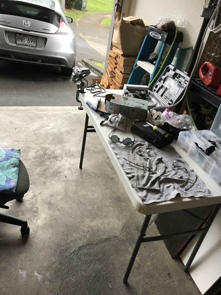 Aloha OF. My names Robert (Lopaka is Hawaiian for Robert), and I live on the east side of Oahu like my profile pic says. I'm an old Oakley fan since my first M frames back in the 90's. And while I'm not a heavy collector like a lot of you, I've found that I really enjoy fixing up my own glasses. I live in a townhouse with a two car enclosed garage, and don't have any extra space for my extra hobbies. So my garage is where I do all my work, because it's easy to pull a car out and set up a table or two. The back of my garage is a mess, and someday I'll take a whole picture 'after' I clean up. I have (wifes) stuff in boxes, stacked up on the side, from when we moved in 5-6 years ago. Lol.