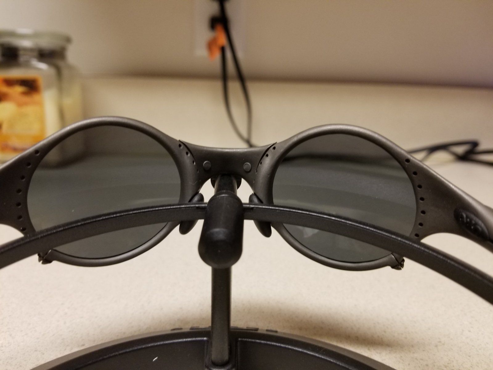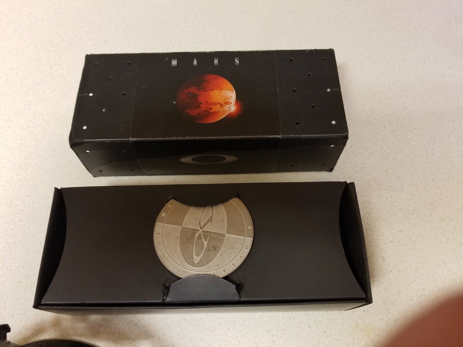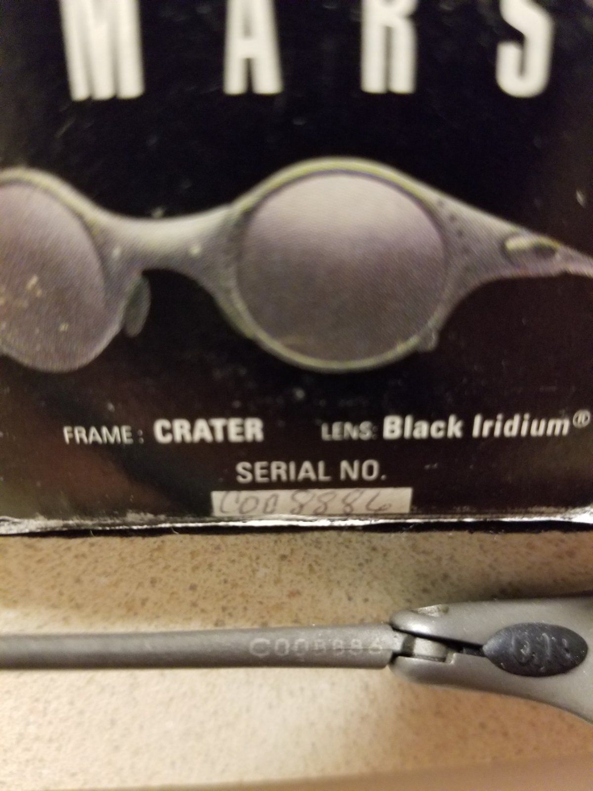 Next up Mars Crater with matching box, lenses were just replaced custom cut by Chris A Hardaway from Crosshair 2.0 lenses. Frames are xman tuned recently beyond factory tight and in great shape. There is a small light faded area spot or two next to the right lens I have attempted to capture in photos. Earsocks are recently replaced black OEM. Box is about a 7.5 to 8 out of 10 same as the Mars Jordan inner box is in great shape with coin foam is replaced brand new Ali special. No paperwork. Outer sleeve shows some wear around edges. Will come with matching box new foam no paperwork with coin and Oakley MF bag.
