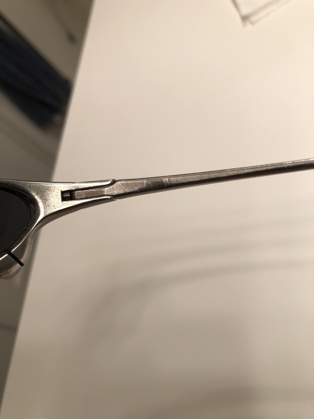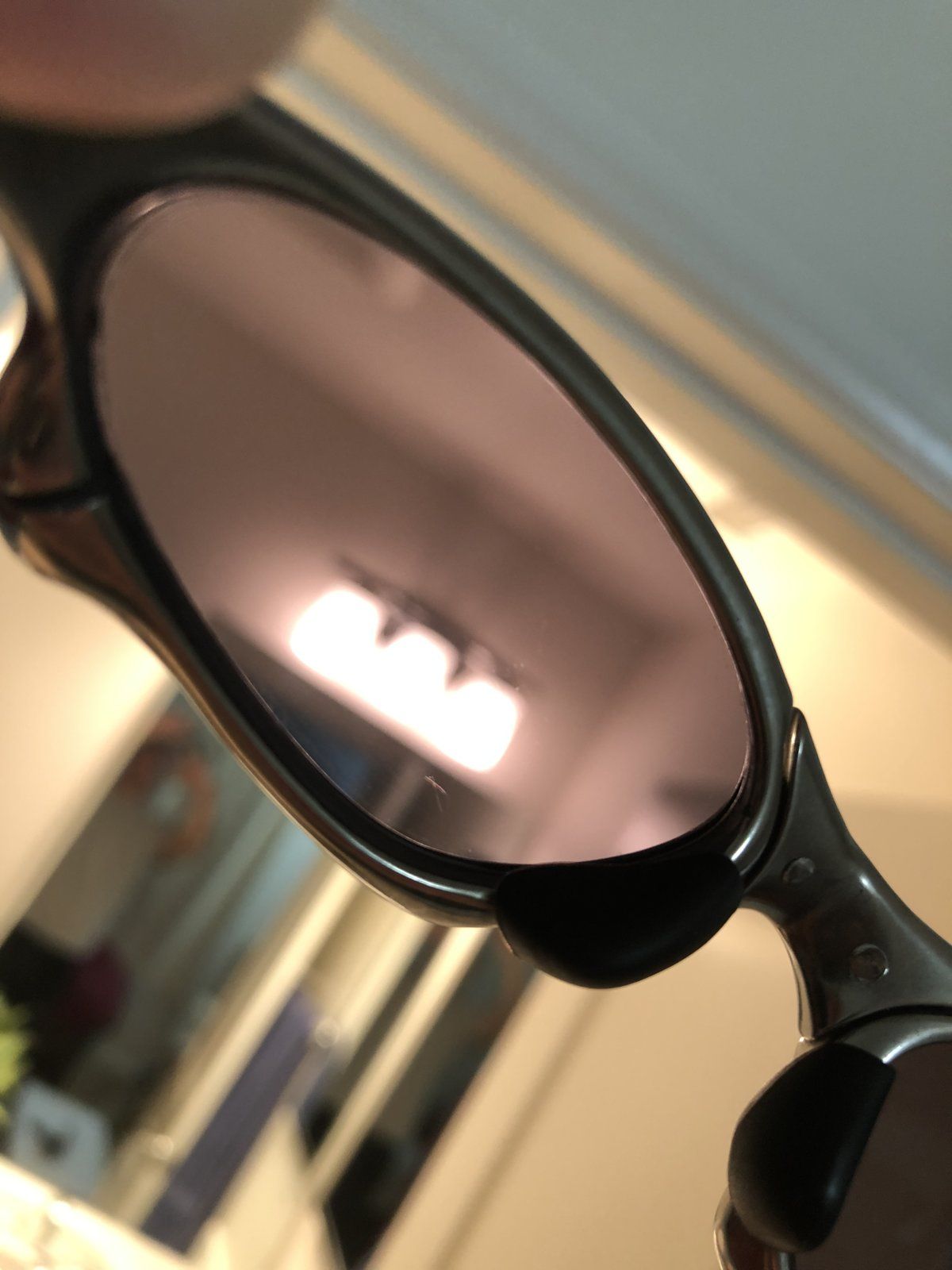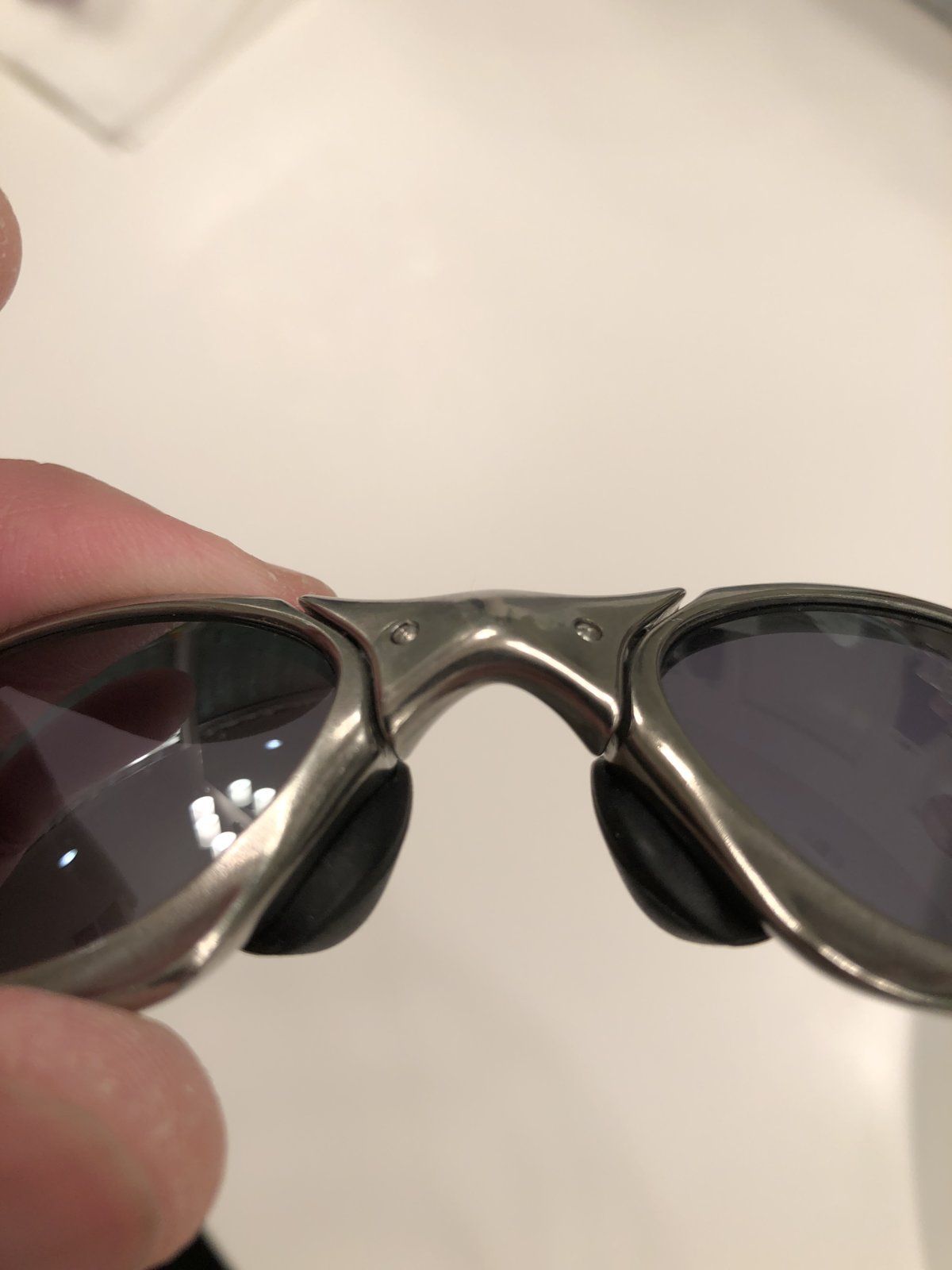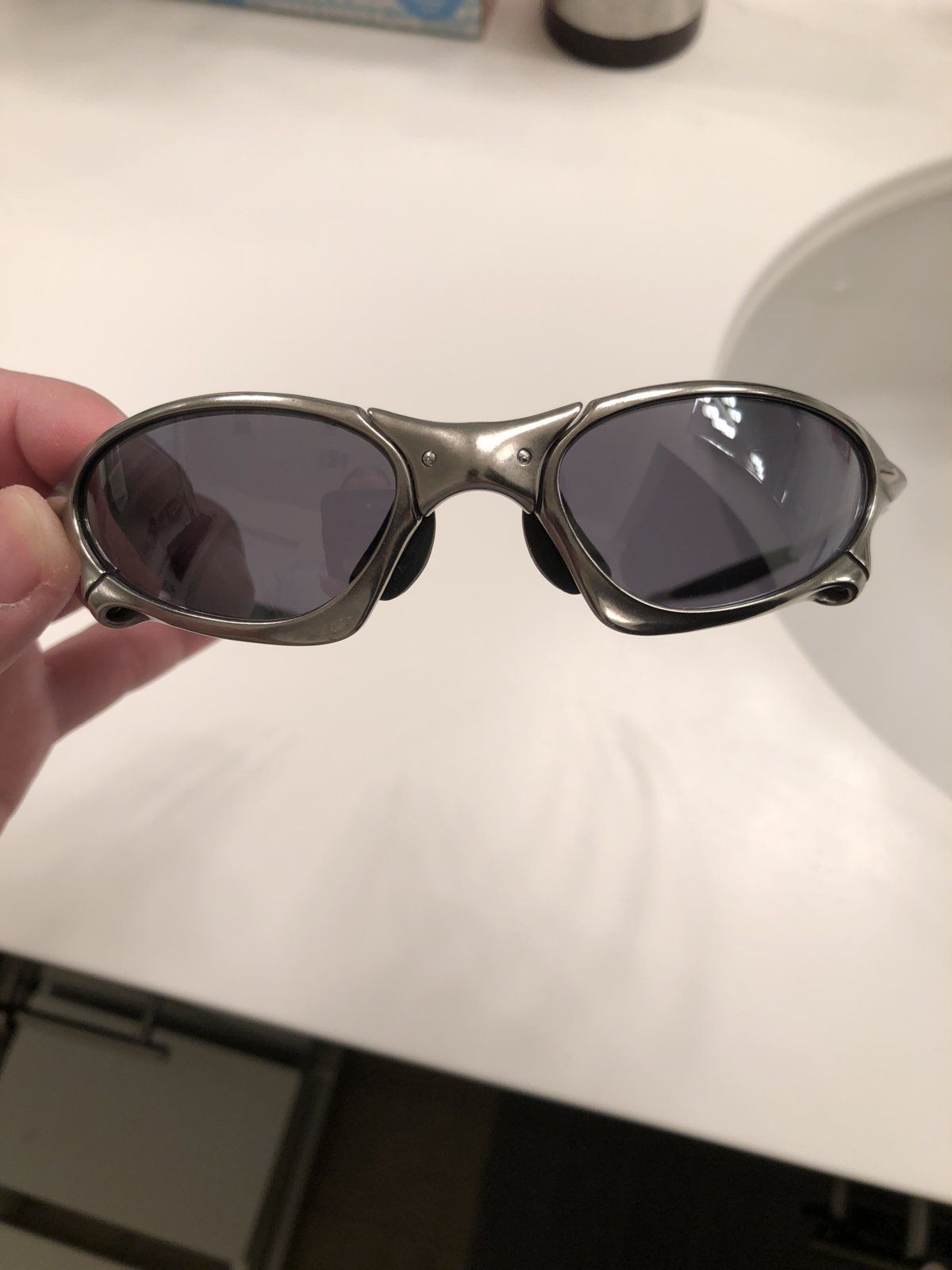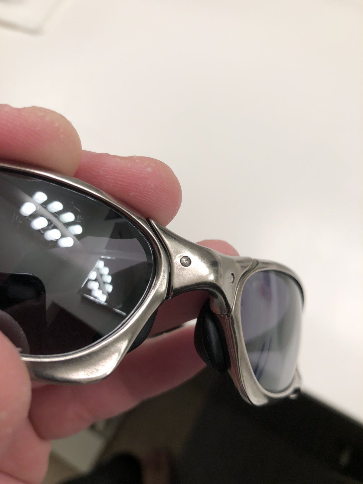 For Sale is a polished Penny with Black Iridium Lenses. Some discoloration on the frame (patina). Small scratch on outer right side of bridge near pin. Bridge is tight and not needing a tune. Lenses have scratches in center of vision. Rubbers in like new condition.