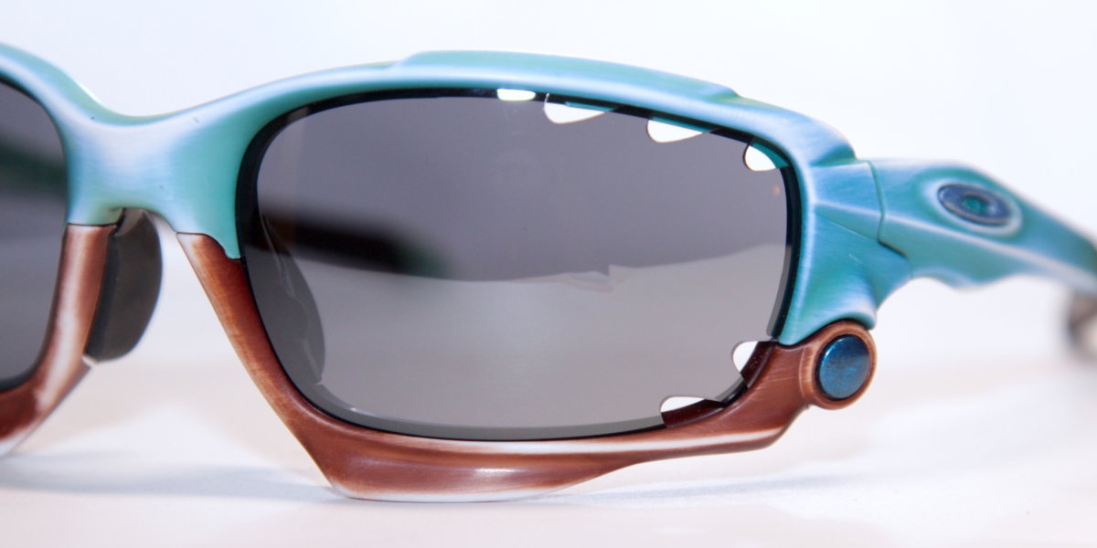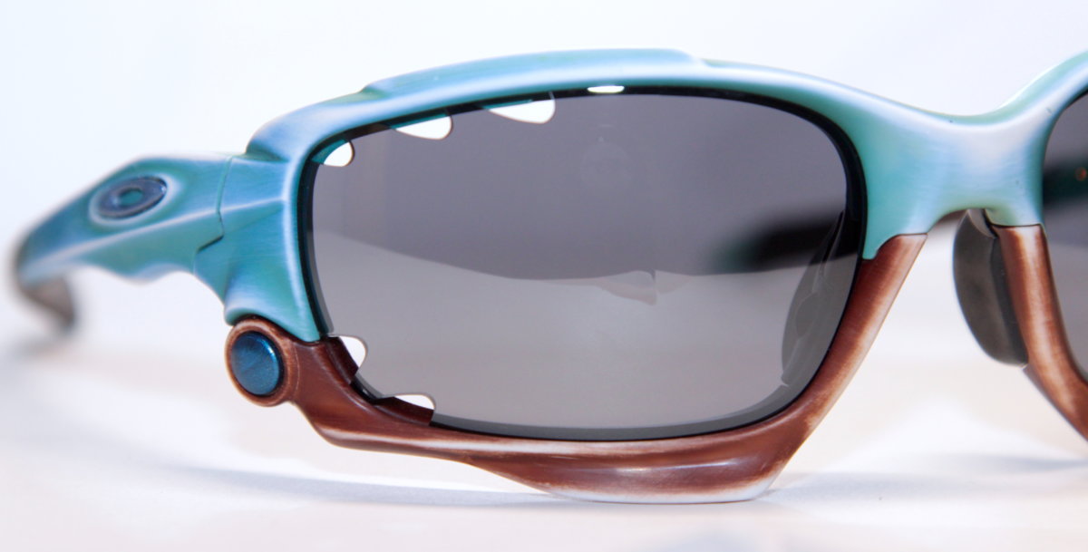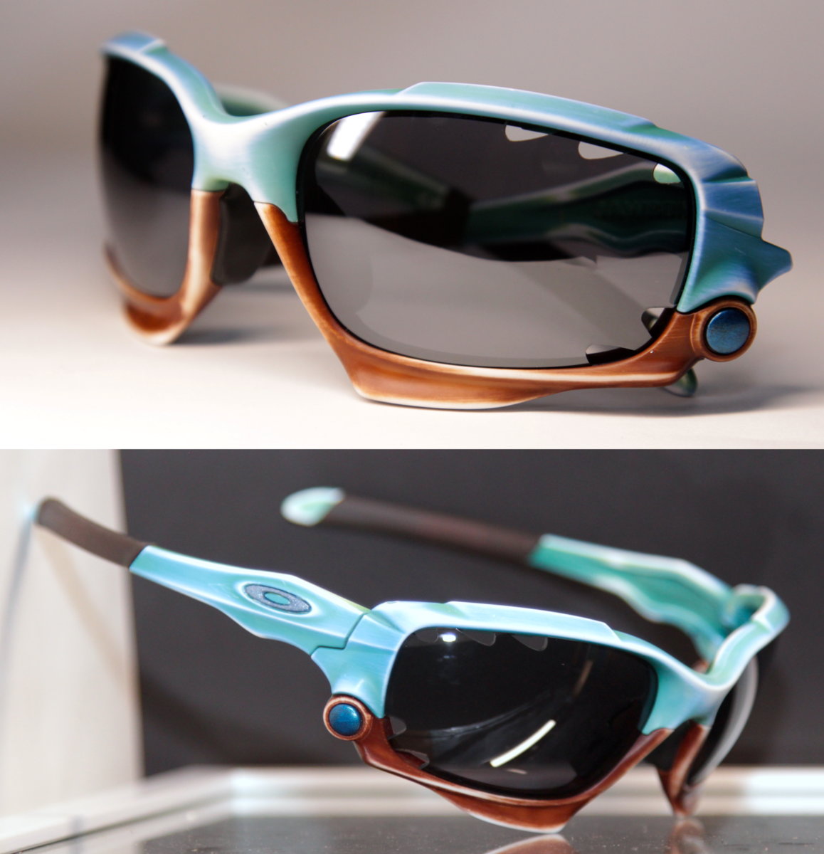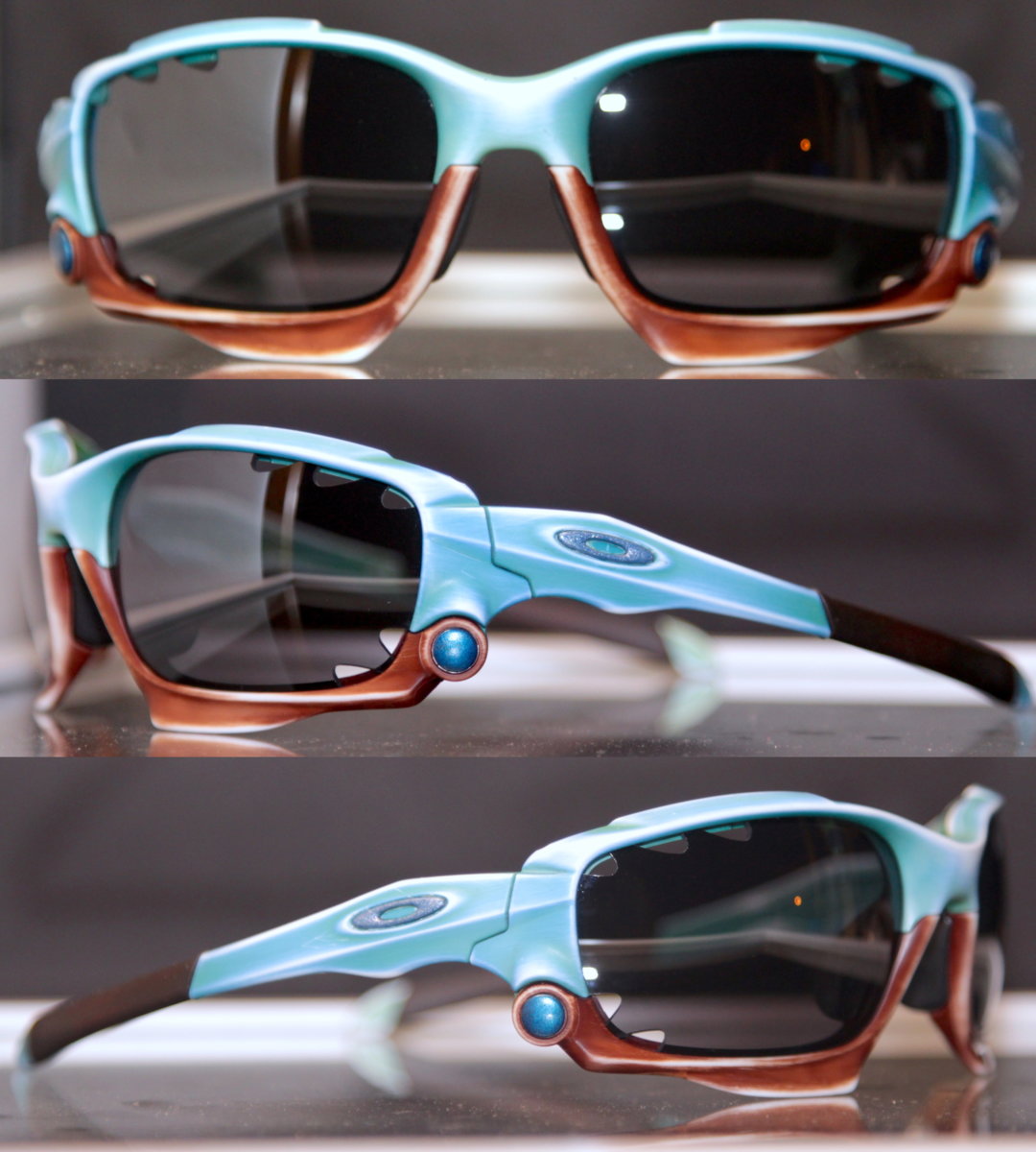 One of my cleaner creations, but still a victim to my crapmanship; the right temple’s outer surface between the icon and rubber has 3 thin scratch lines (not part of the original design d'oh), not particularly noticeable due to the worn design but worth mentioning. Besides that the arms have a bit of play when closed but still retain the snappy feeling in opening and closing, the nose bridges' edge where the front the top surface meet has a couple small nicks as well (present prior to dying). There's a new set of large nose pieces on there now, but could swap on a small size if buyer prefers. The socks are in okay shape, while the both the bolts and icons are flaw free.