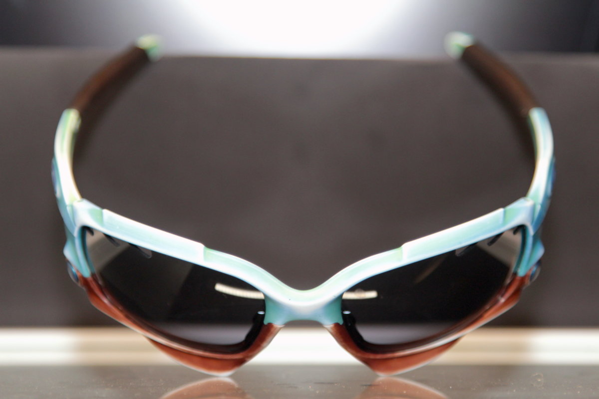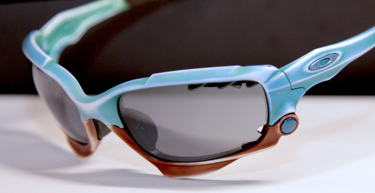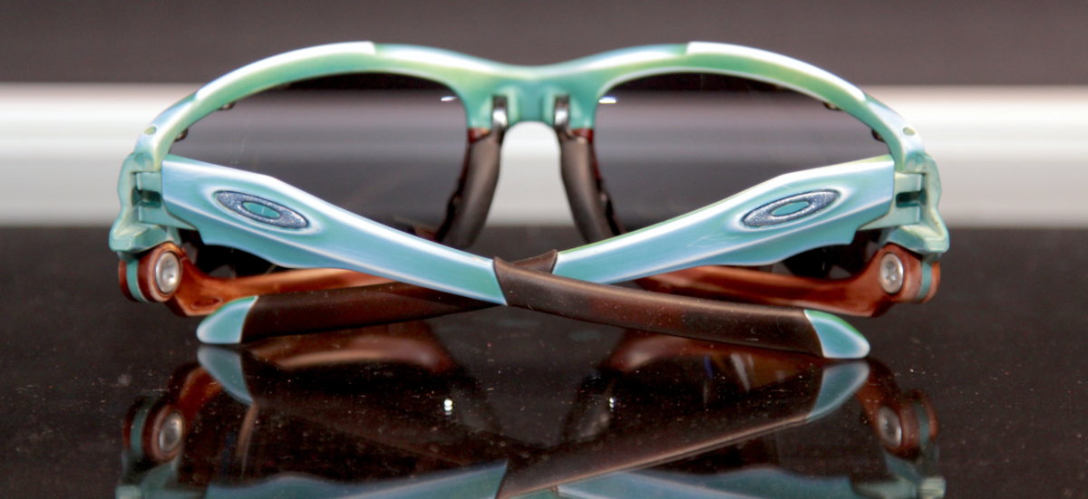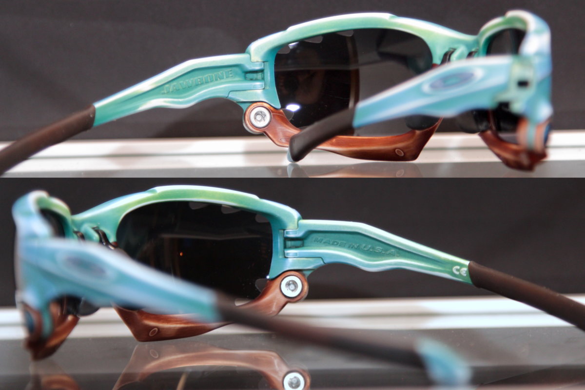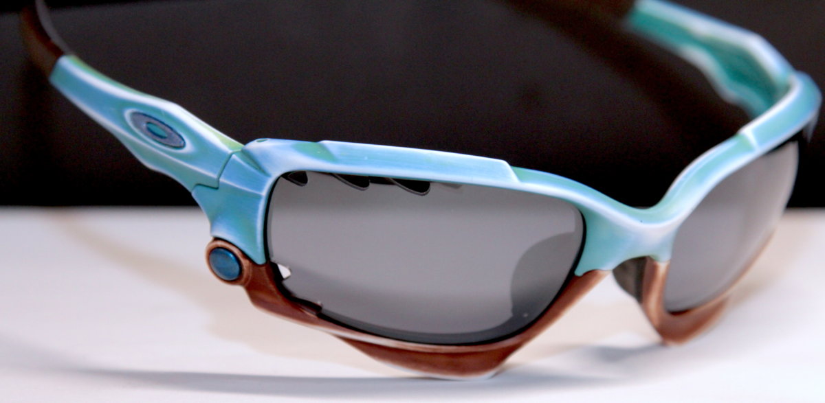 One of my cleaner creations, but still a victim to my crapmanship; the right temple’s outer surface between the icon and rubber has 3 thin scratch lines (not part of the original design d'oh), not particularly noticeable due to the worn design but worth mentioning. Besides that the arms have a bit of play when closed but still retain the snappy feeling in opening and closing, the nose bridges' edge where the front the top surface meet has a couple small nicks as well (present prior to dying). There's a new set of large nose pieces on there now, but could swap on a small size if buyer prefers. The socks are in okay shape, while the both the bolts and icons are flaw free.