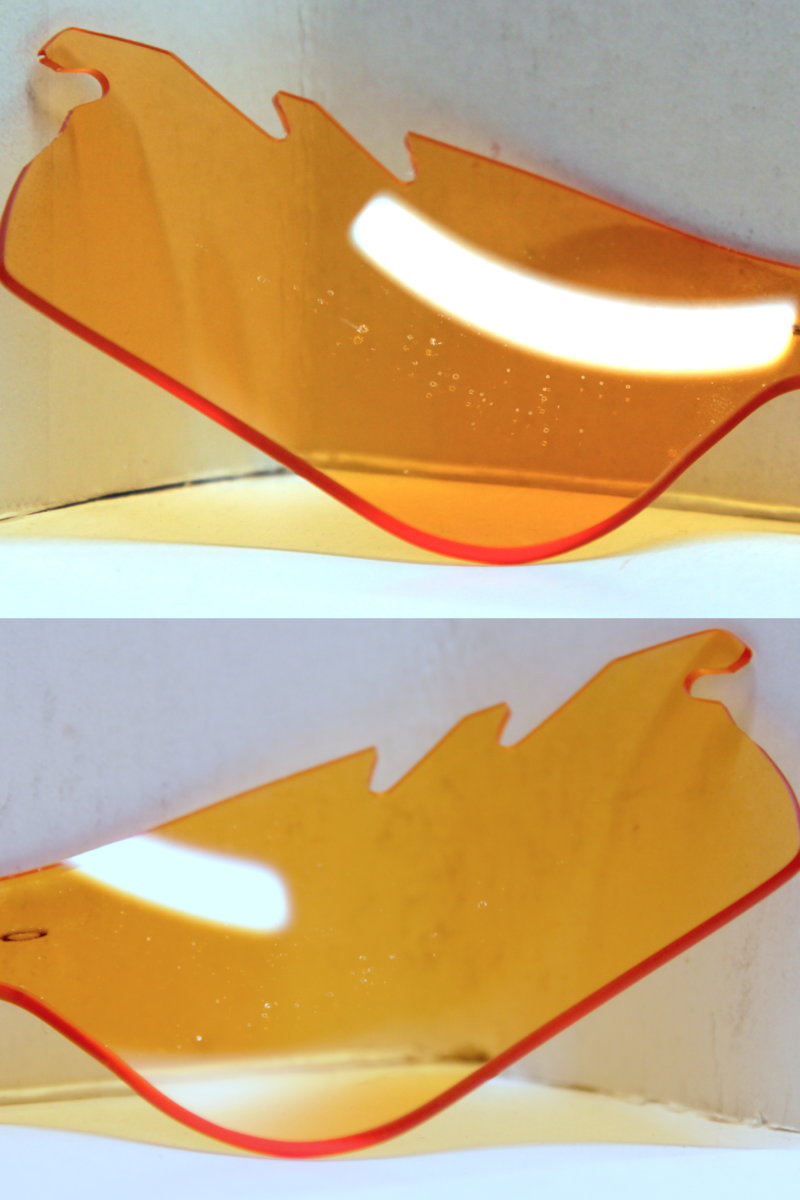 Both lenses interior surfaces' film coat has bubbled across the lower center portion of each.From searching it would seem it's a complete gamble on if the coating will continue to peel on the interior, or stay the way it is - as all the tints that came to me with the cc peel haven't accelerated past the 1cm or so of wear, although they were all around the edges and not the middle of the lens. As such I'm flexible on the pricing.