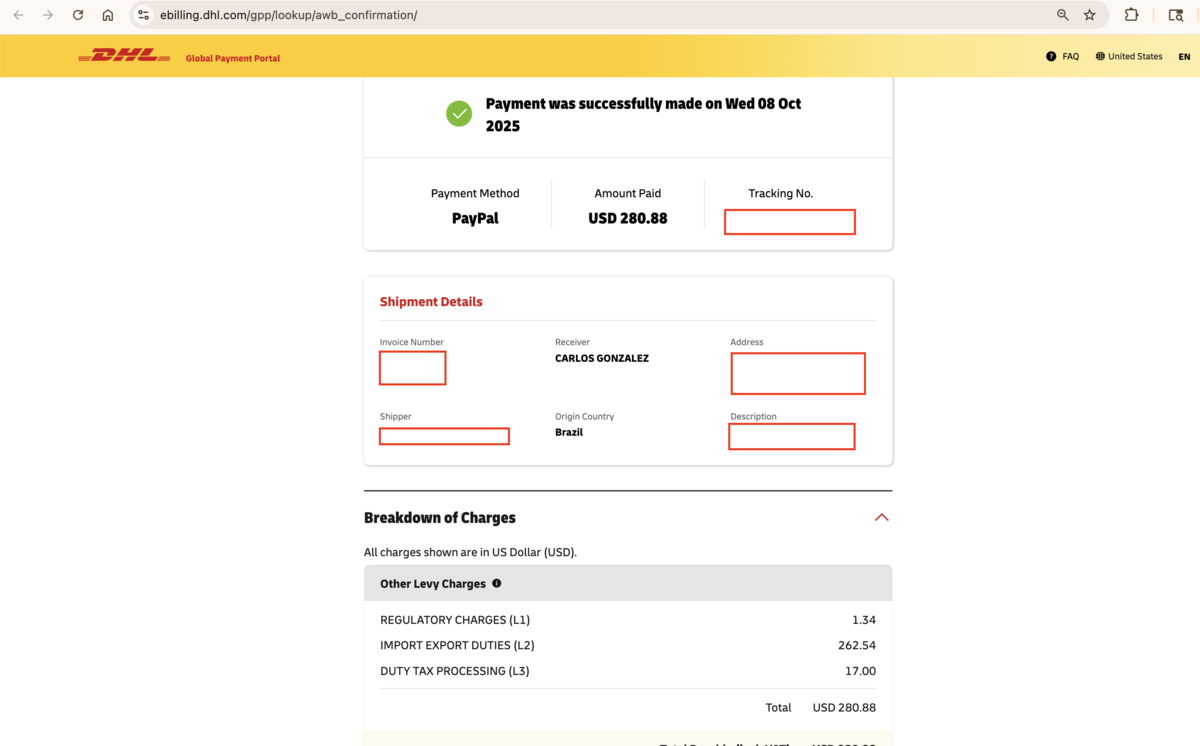 - DHL acted as customs broker and sent a bill for ~$280 USD (see screenshot)