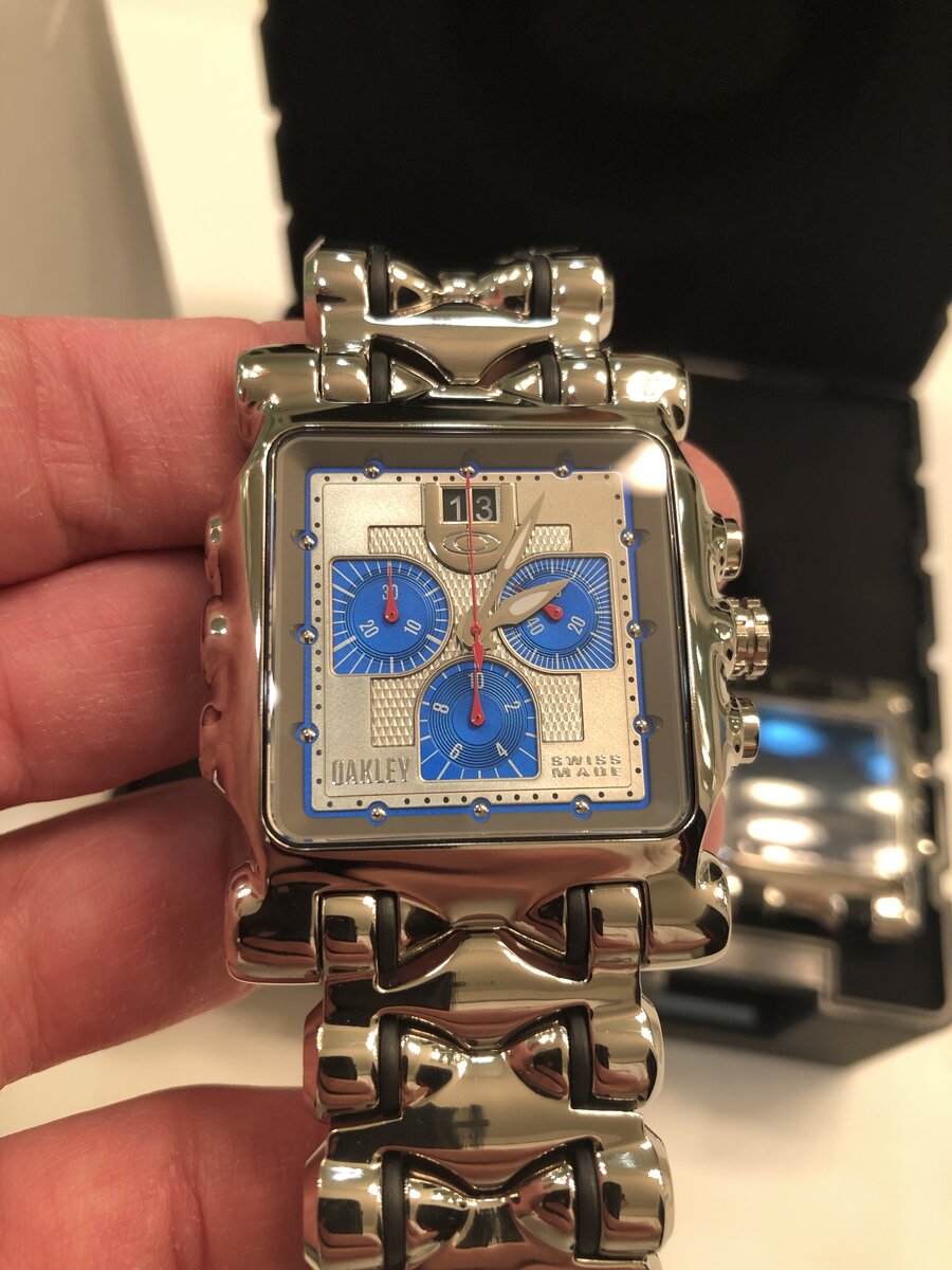 Polished Blue Minute Machine. LNIB. Displayed only. The only mark I see is at the unpolished area next to the clasp pin. No issues with movement. Includes watch with all 13 links, storage case, outer cardboard box, and a spare brand new polished watch case (does not have a crown or back cover).